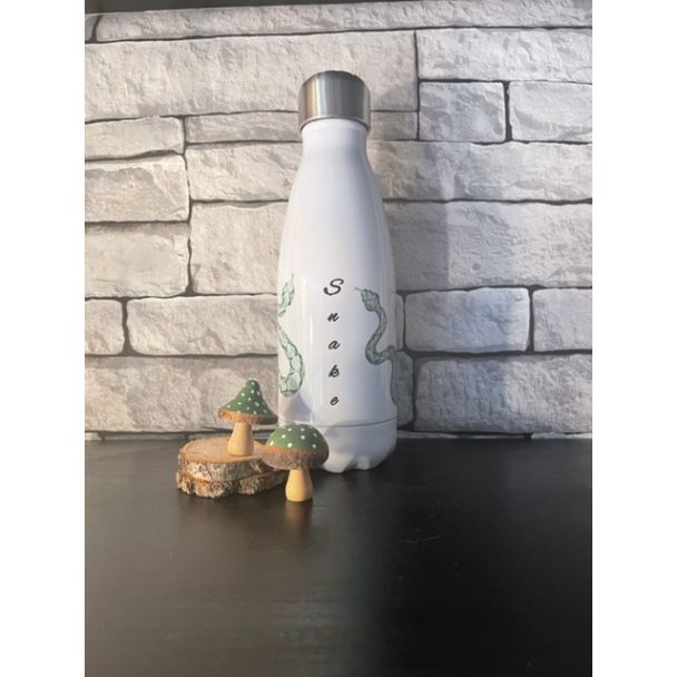 De thermosfles kun je het beste met de hand afwassen, zodat het vacuüm en de bedrukking goed blijven.