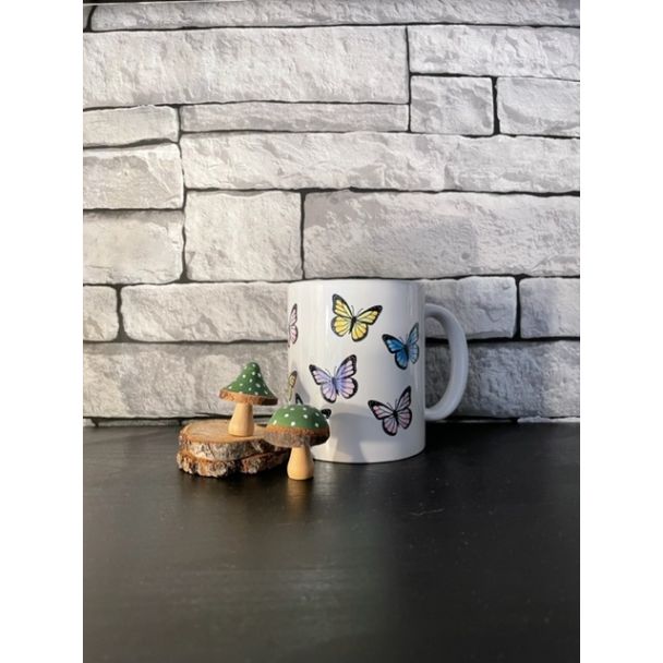 Deze mok heeft een afbeelding van verschillende vlinders.