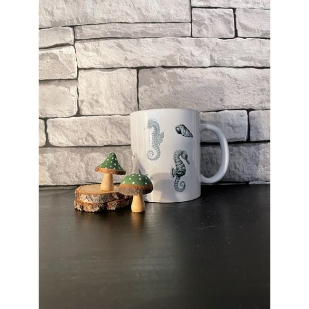 Deze mok heeft een afbeelding van verschillende zeepaardjes en schelpen.
