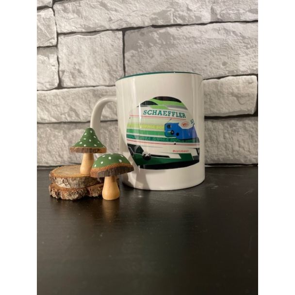 Deze mok heeft een afbeelding gebaseerd op de helm van Sophia Floersch en is voorzien van nummer 99.